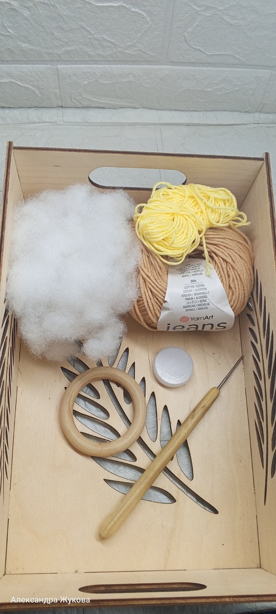 Пряжа Ян арт джинс. Крючок у меня #1.75. Колечко деревянное, и гремелка. Глазки и дополнительная пряжа для бровок и цветочка.