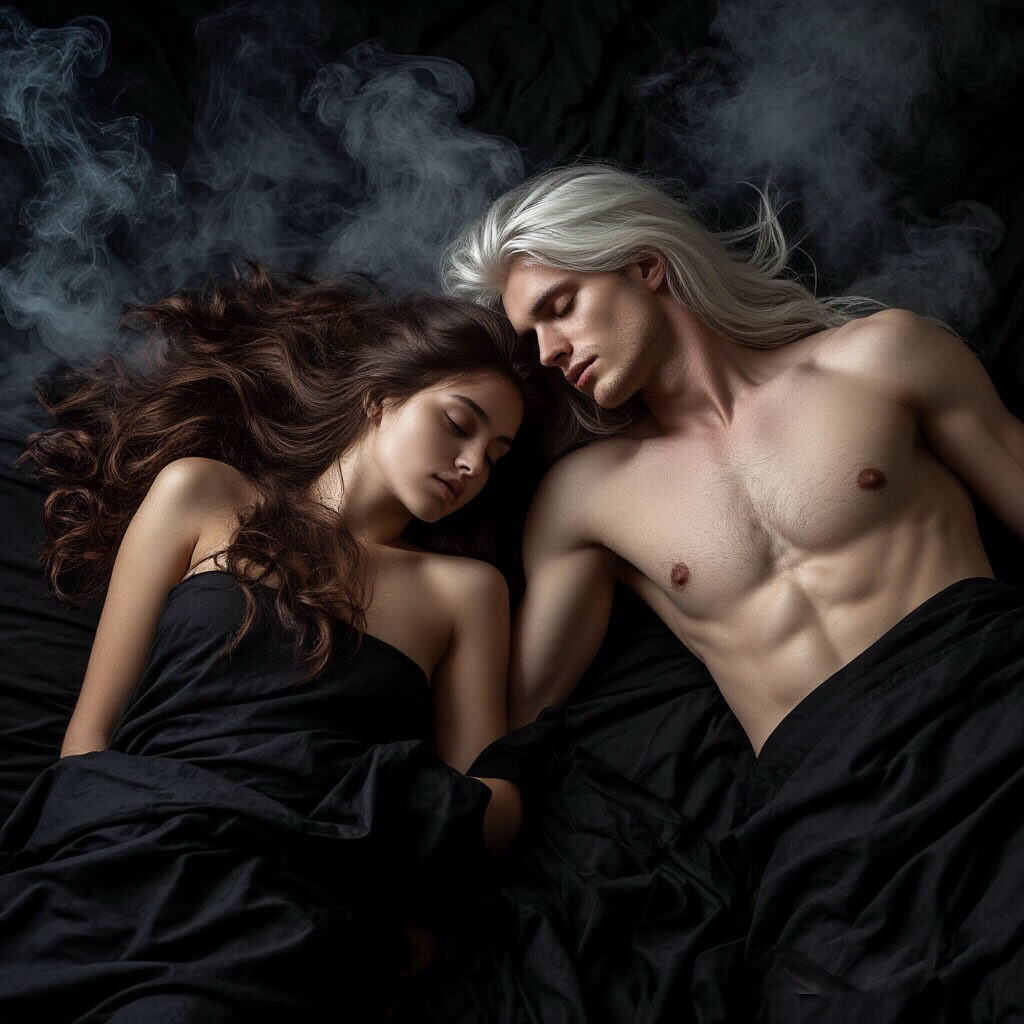 Глава 19 Лунный свет струился сквозь витражное окно спальни, окрашивая кожу Дэи в перламутровые оттенки. Она лежала на спине, чувствуя, как ковёр из теней под ней шевелится – Даррэн заботливо подстелил его, чтобы каменный пол не холодил ей спину. — Ты сегодня тихий, — прошептала она, проводя пальцами по его груди, где обычно пульсировали магические символы. Теперь там остался лишь шрам – её имя, выжженное её же кровью в тот день, когда он переписал контракт с Ллирайн. — Демоны не шумят, когда молятся, — его голос звучал как шорох углей под пеплом. Он коснулся её ключицы губами – не поцелуем, а дыханием. Там, где его горячие губы касались кожи, расцветали синие узоры, как иней на стекле. Дэя вздохнула, когда они тут же таяли, оставляя лишь мурашки. — Это... ново. — Это я, — он провёл языком по её запястью, и она вскрикнула – не от боли, а от переизбытка. Как будто кто-то влил в вены жидкое солнце. Его тени обвили её бёдра, но не сковывали – ласкали, повторяя к