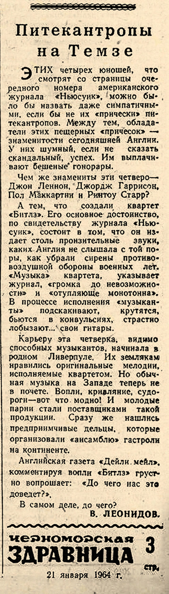 Нынешним скрепным борцам с современной культурой полезно было бы изучить опыт своих советских предтеч и соотнести его с тем, что из этой борьбы вышло. То есть, ничего не вышло. Но какая же дичь печаталась! Вот пример из советской прессы 60-х – заметка о «Битлз» под названием «Питекантропы на Темзе» (21 января 1964 года) в сочинской газете. Про «четвёрку, видимо, способных музыкантов». Джордж Гаррисон … Ринтоу Старр … Забавно. На фоне таких заметок знаменитая фраза Бориса Гребенщикова звучит как приговор тщетным усилиям тогдашних борцов с современностью. См. из той же «серии» - «Хулиганские, закрывающие весь лоб чёлки» *** Больше музыки в нашем Телеграм-канале «We Will Rock You»! Заходите, подписывайтесь, слушайте, смотрите!