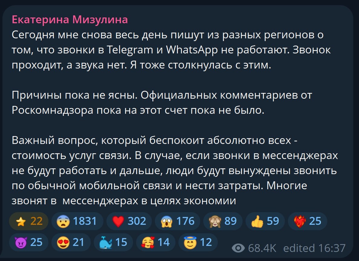 А у вас тоже сбоила сегодня голосовая связь в Whatsapp и Telegram? Звонки в мессенджерах могут не работать из-за выборочных блокировок Telegram и WhatsApp, тестирование которых начались еще 1 августа, рассказал источник «Ъ». В Роскомнадзоре не ответили на запрос «Ъ», в «Вымпелкоме», «МегаФоне», МТС, Т2 отказались от комментариев. Оказывается еще в декабре в «Ъ» была статья, что, действительно, рассматривается два сценария: блокировка голосового трафика только из-за границы и полный запрет на голосовые звонки в мессенджерах, то есть это история не одного дня. Конечно же, в самых благих целях защиты от кибермошенников. В случае с одним мессенджером можно было бы предположить технический сбой, но раз это происходит сразу с двумя мессенджерами одновременно, действительно, можно предположить некие учения по блокировке конкретно голосовых звонков через мессенджеры. Все это происходит на следующий день после поста "кровавой барыни", что операторы якобы попросили запретить голосовые звонки