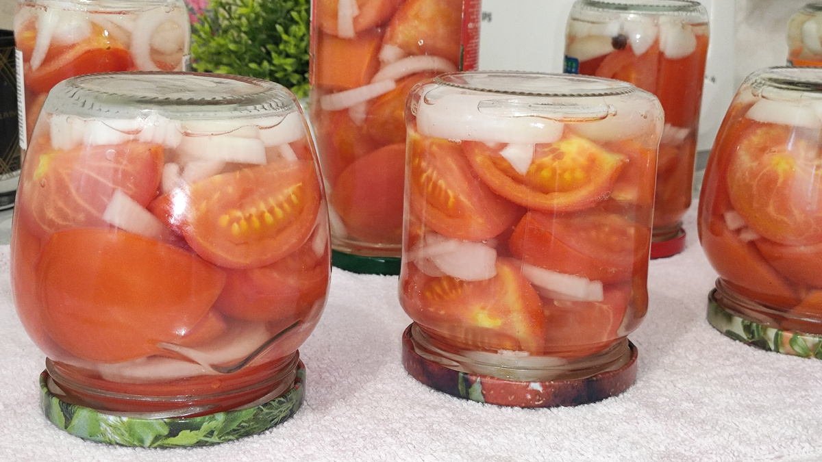 Обязательно предварительно стерилизуем стеклянные емкости удобным способом (например, над паром, в духовке или микроволновой печи). Далее начинаем выкладывать ингредиенты слоями: первым слоем пойдет нарезанный лук и кусочки чеснока, вторым слоем будут ломтики наших свежих помидоров. Повторяйте последовательность слоев, пока банка не заполнится почти полностью. Сверху в каждую банку добавить 1 столовую ложку растительного масла.