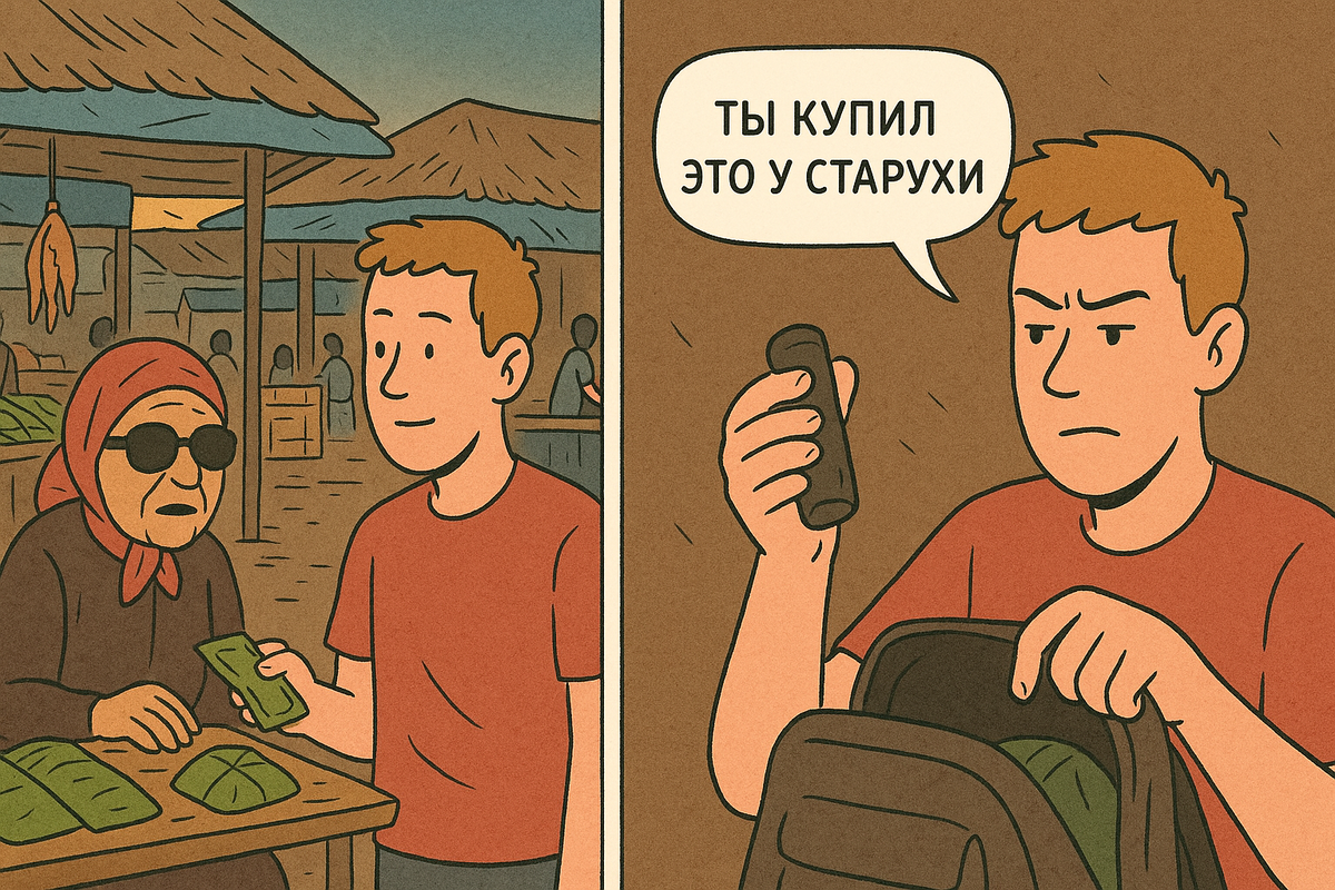 В Камбодже можно купить всё: от жареных скорпионов до поддельных дипломов Гарварда. Но я, кажется, случайно купил улику. И теперь понимаю, что в мои планы на кругосветку «неожиданно ввязаться в криминальную историю» не входило. Меня зовут Тим, я ирландец с русско-армянскими корнями, путешествую без перелётов и всё сливаю в свой Телеграм-канал «В погоне за необычным» — даже то, что умные люди обычно не рассказывают публично. Рынок в провинции выглядел как параллельная вселенная: Перед ней на тряпочке лежали свёртки из банановых листьев. — Что это? — спрашиваю.