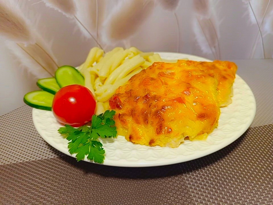 1 куриная грудка(срезать филе с кости, кожу удалить). Для шапочки: 1 большая луковица, 1 средний мясистый помидор, крупный зубок чеснока, 1 яйцо, 100 г твердого сыра( не продукта), 4 ст.л. майонеза, соль, специи. Куриное филе нарезать наискосок на медальоны, толщиной 1 см. Положить на доску, посолить, поперчить, посыпать прованскими травками или своими любимыми специями. Накрыть пакетом и слегка отбить. Переложить на противень. Приготовить шапочку. Луковицу нарезать мелким кубиком и обжарить на раст. масле до золотистой корочки. Помидор нарезать кубиком, чеснок и сыр натереть не мелкой терке. Жареный лук и все остальные продукты для шапочки хорошо перемешать. Нанести приблизительно по столовой ложке намазки на каждый кусочек филе. Равномерно распределить. Запекать при тем. 200* 25 минут. Угощайтесь!!!