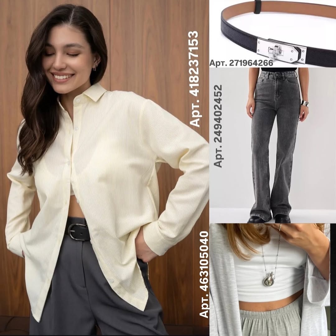 - Держите базу нейтральной. Кремовая рубашка (арт. 418237153) и белый кардиган-комплект (арт. 258848786) — два «якоря», вокруг которых строятся десятки сетов.
