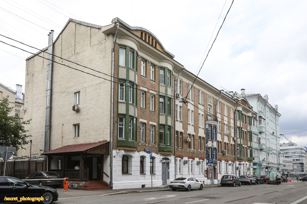 А на улицу Щепкина смотрят целых пять эркеров – округлых и облицованных цветной плиткой-кабанчиком, зеленой и глубокого синего цвета. Сами же фасады выложены песочно-коричневой плиткой и декорированы мелкими керамическими вставками с цветочными узорами.