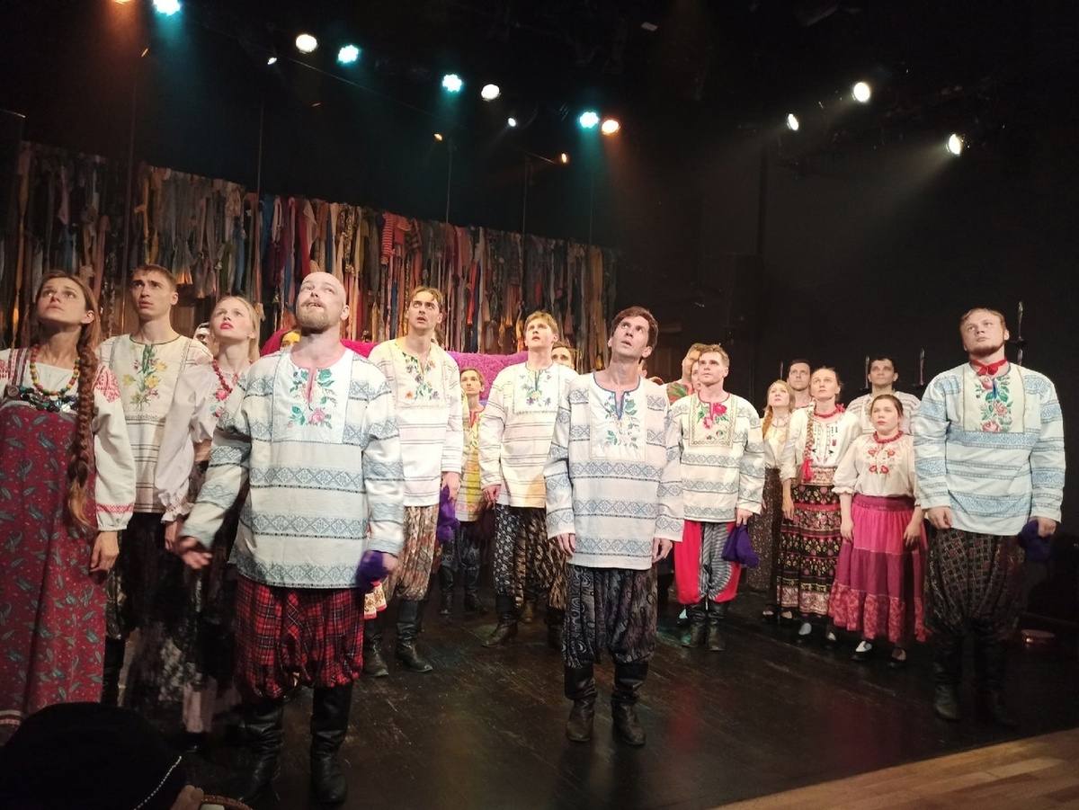 Свисающие вроде занавеса яркие тряпки, казаки в фиолетовых шапках с помпонами, половники в руках у женщин – как предмет безысходного быта, а в руках мужчин блещут воинственно или превращаются в винные чаши; пляшущие парубки да обмотанные верёвками и лентами трубы, и