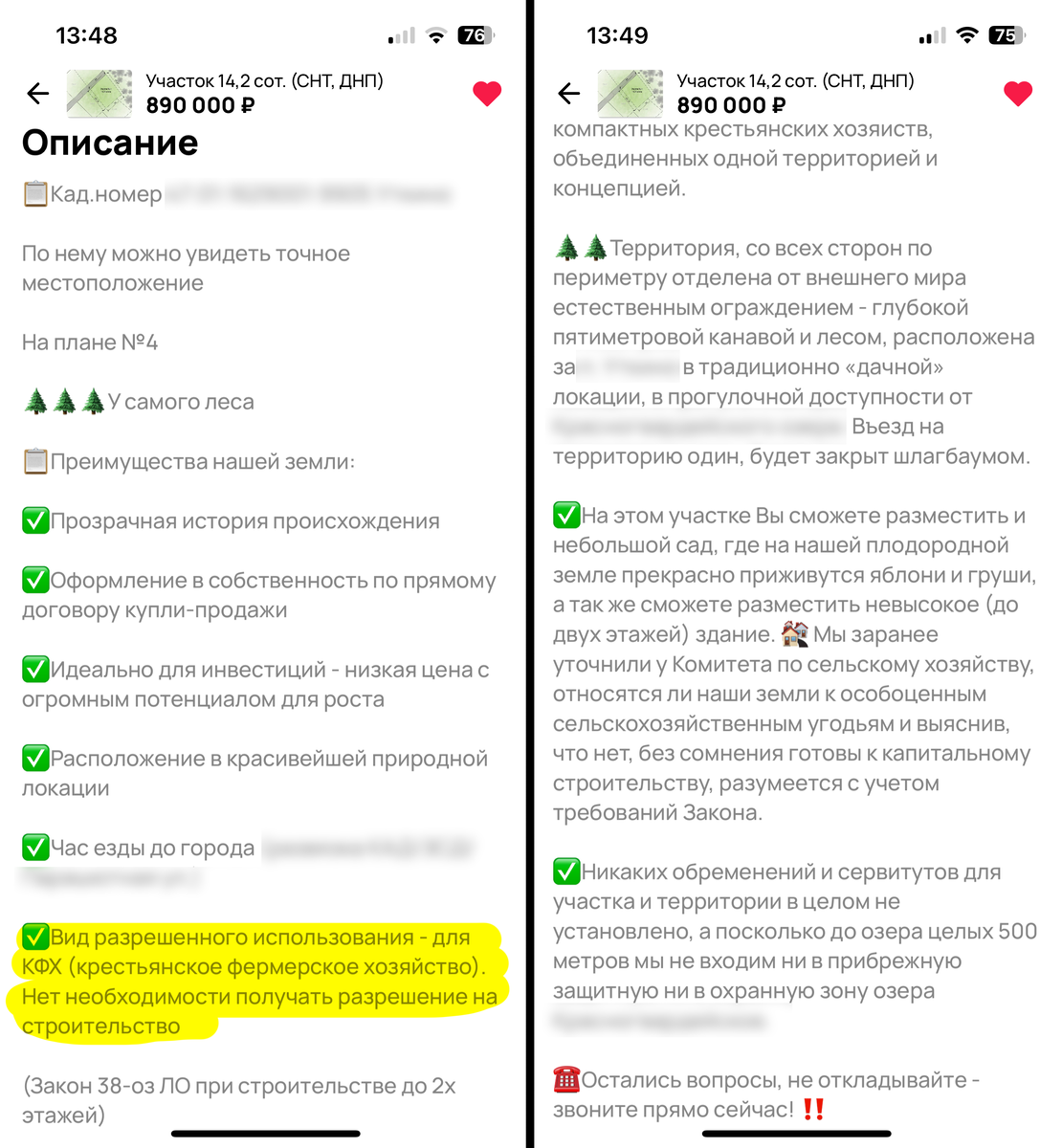 Не так давно, случайно наткнулся на интересное объявление на всем известной онлайн площадке. Объявление уже сняли с публикации, и я с чистой совестью могу о нем написать. Продается участок на землях КФХ, за небольшие деньги под строительство, которое может ввести в заблуждение неопытного покупателя земли. Авторы объявления намерено избегают термина «жилой дом», а используют в место него слово «здание» и изобилуют фразами «дачная локация», «капитальное строительство» и ссылками законы. Формально не придерешься. Про жилье и слова нет, а про стройку есть.