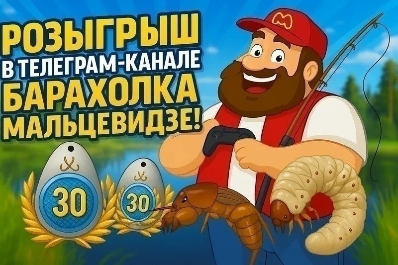 Розыгрыш в Телеграм-канале Барахолка Мальцевидзе Для участия нужно под постом с розыгрышем - https://t.me/pp4farmtrofMARKET/4622 нажать на кнопку "Участвую". Отправь ссылку на розыгрыш другу - за каждого приглашенного вы получите дополнительные билеты и повысите свой шанс на победу! Чем больше пригласите - тем больше билетов на розыгрыш вы получите!!! Призы: 1) Прем 30 дней (или 5 голды) + Катушка низкопрофильная Winner NG LP-HS (4,5кг) 2) Медведка = 100 шт. 3) Личинка жука - носорога = 100 шт. 4) Личинка майского жука = 100 шт. 5) Ящик водки Tungus + Шаманский Бубен = 1 шт. 6) Вино Kuban Blance = 10 порций 7) Коньяк Маршальский = 20 порций + Рыболовный стул 1 шт. 8) Вино Ruby Diamond = 10 порций 9) Коньяк Генеральский = 100 порций 10) Водка Золотой Империал = 10 порций Призы только для игроков RU региона. Итоги: 31 августа 2025г. 10 призовых мест. Спасибо за призы: F1nka_ (Сеня) Вурдалак (Александр) Никита Корчагин