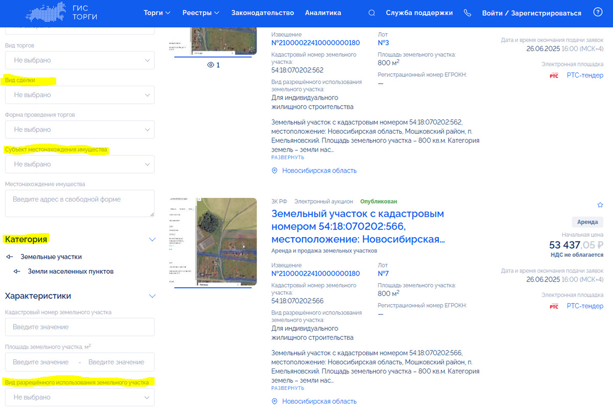 Выбор участка начинается с единой торговой платформы Гисторги. Она объединяет лоты с разных торговых площадок, на которых непосредственно идут торги. Сайт достаточно удобен, но функционала недостаточно. Например, здесь нет карты для поиска лотов в нужном регионе и приходится фильтровать позиции вручную, на что обычно уходит много времени.