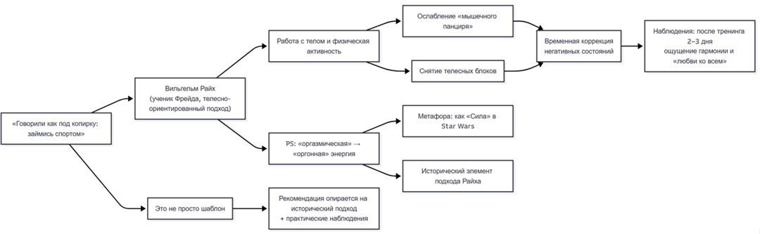 Из его работ можно сделать вывод, что работа с телом, включая физическую активность, помогает в некоторой степени при любых психологических запросах.