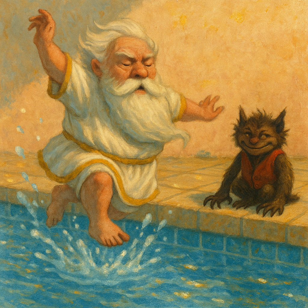 Паампез слез с парапета башни, подошёл, шлепая босыми ногами по нагретым плитам к небольшому бассейну, выложенному голубым кафелем и, как был в белой с золотом тунике, так и бросился по-мальчишески в прохладную воду, несмотря на многотысячелетний возраст. Белая по пояс борода намокла и прилипла к одежде. Он опять нырнул и принялся плавать под водой от одного борта к другому.