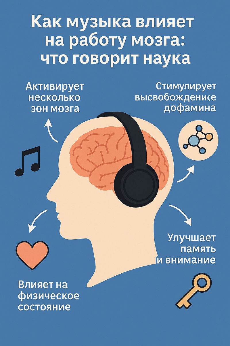 Музыка сопровождает нас везде — от утреннего будильника до вечерних плейлистов перед сном. Но за привычным мелодичным фоном скрывается мощный инструмент, который влияет на эмоции, память, внимание и даже физическое состояние. Давайте разберёмся, что происходит в мозге, когда мы слушаем музыку. В отличие от речи, которая обрабатывается в основном в левом полушарии, музыка «поджигает» сразу целую сеть областей — слуховую кору, моторную кору, гиппокамп, миндалину и даже зоны, связанные с дофамином. Исследования с помощью МРТ показывают, что любимая музыка вызывает выброс дофамина — нейромедиатора «радости». Это объясняет, почему любимый трек может поднять настроение или вдохновить. Музыкальная терапия активно применяется для людей с болезнью Альцгеймера: знакомые мелодии помогают им вспоминать события, имена и лица. А у студентов фоновая спокойная музыка может улучшать концентрацию (но только при низком уровне громкости). Ритмичные треки помогают бегунам дольше сохранять темп, а медленны