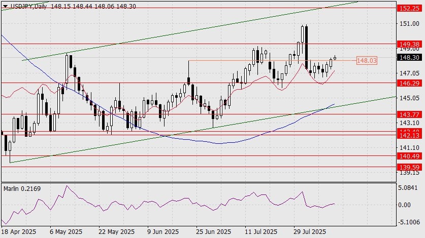Пара USD/JPY вчера преодолела сигнальный уровень 148.03 (вершина 23 июня), сегодняшний день открылся выше него, а сигнальная линия