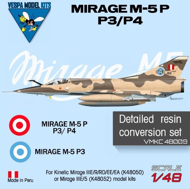 Vespa Model Kits из Перу в сентябре выпустит смоляные конверсионные наборы для постройки моделей Mirage 5P/P3/P4 и Mirage 5SDE-2 в масштабе 1/48 на базе моделей Mirage IIIE от Kinetic: Mirage М-5P/P3/P4 (каталожный номер VMKC 48009) Mirage М-5SDE-2 "Horus" upgrade conversion (VMKC 48015)