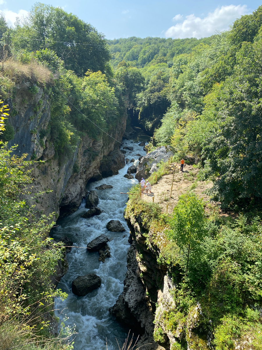 Сегодня завершу цикл записок про отпуск в Адыгее. Первый день - здесь. Второй день - здесь. День отъезда встретил нас прозрачным голубым небом и веселым солнцем. Эх, вот бы эти два дня поменять местами, чтобы поездка на Лаго Наки оказалась более успешной… Но это же отпуск, погоду выбирать не приходится - работаем с тем, что есть😁. Мы собрали вещи, сдали номер и покатили в Хаджокскую теснину. Эта локация находится недалеко от водопадов ручья Руфабго. И было удобно, что расположена аккурат на нашем обратном пути. Рядом есть небольшая парковка, вход платный. Пока мы гуляли по тропе, я видела несколько групп с экскурсоводами, краем уха кое-что подслушала. Мы же на входе их не заметили, а жаль - я больше люблю приправленные подробностями прогулки, нежели самостоятельный осмотр. Хаджокская теснина - это ущелье, по дну которого несет свои воды река Белая. В самом узком месте просвет всего 2,2 м. Маршрут не слишком длинный, у нас ушло чуть больше часа на осмотр. Есть несколько выгодных смотр