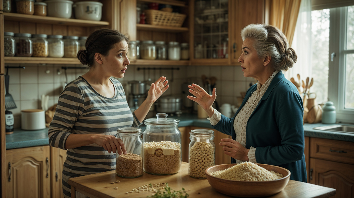 На следующий день Анна пошла за солью и остановилась в дверях кухни. Все банки и контейнеры были аккуратно переклеены: "крупы", "завтраки", "под праздники". На видном месте стояла огромная банка сухарей, её рис исчез в дальнем углу.