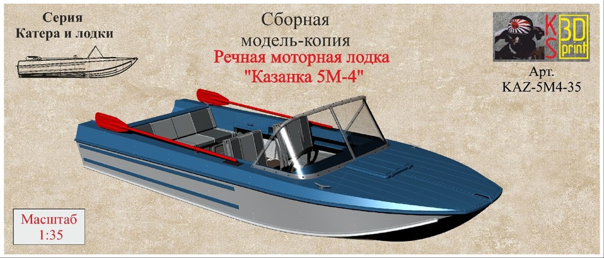 Московская "Картонный самурай" выпускает на 3D-принтере модели моторной лодки "Казанка 5М-4" в масштабах 1/35 и 1/43.