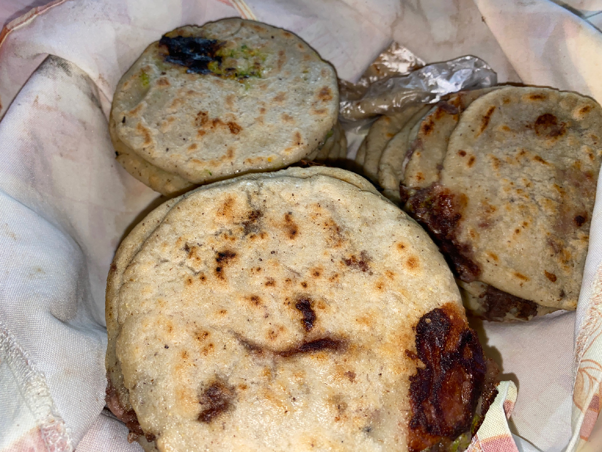 Попуса — это круглая лепёшка из кукурузного теста, внутри которой спрятана начинка. Жарят её на такой раскалённой чугунной плите (комаль), что тесто подрумянивается, а начинка внутри остаётся сочной и горячей.