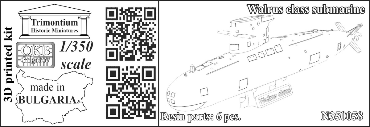 Болгарская OKB Grigorov выпустила на 3D-принтере модель голландской подводной лодки класса Walrus (построено четыре таких корабля в 1985-1992 гг.) в масштабе 1/350: Walrus class submarine (каталожный номер N350058)