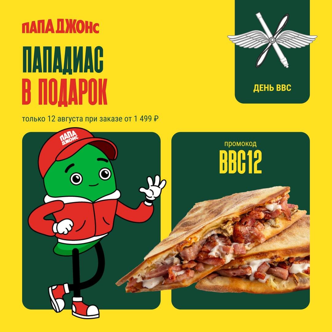 День ВВС в Папа Джонс Только 12 августа при заказе от 1 499 ₽ введи промокод BBC12 и получи Пападиас в подарок 🎁 🍕Отметь праздник вкусно и сытно вместе с Папа Джонс!