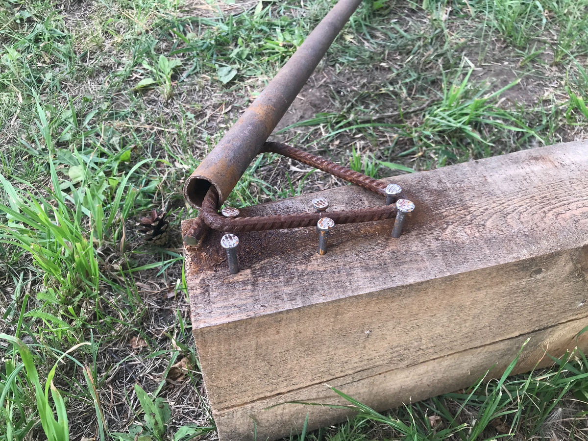 - Забейте гвозди рядом с арматурой в деревянный блок, чтобы надежно закрепить её. Убедитесь, что арматура надежно зафиксирована и не будет двигаться при использовании.