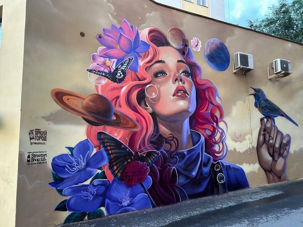 И хотя прошло много лет, её граффити так и не затёрли, не перекрасили. Так и улыбалась в небо девушка с малиновыми волосами и птицей на руке.