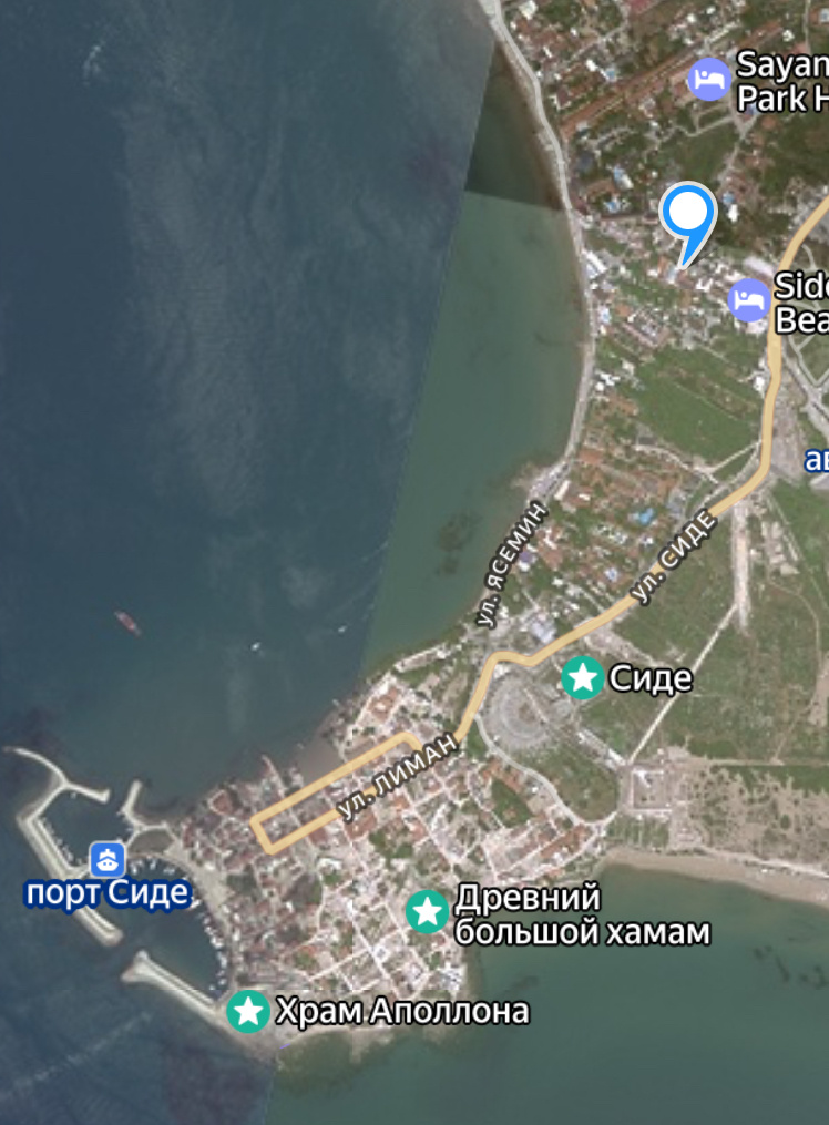 А локация отеля какая потрясающая! А пляж? Ну просто чудо! Подробности. Привет, с Вами Елена. Самое приятное в этой истории, что отель находится в центре Сиде, что до Античного города можно прогуляться без напряга. И что пляж отеля, точнее, два отельных пляжа, "песок песочный"! Наши люди очень любят песчаные и пологие пляжи. Кстати, насчет завтраков и ужинов, а почему бы и нет? “Не обжираться” ведь летим мы в Турцию. А ради теплого моря и горячего турецкого солнца! Кто не понимает радости от 2-разового питания, берите Все включено, и это тоже есть в Selenium. Вот оно! В шаговой доступности! Античный город с Храмом Аполлона, аптеки, любимые россиянами А101, Migros, Carrefour, магазины-торговые центры, где представлены турецкие бренды Waikiki, Mavi, Coton, DeFacto, Collezione и пр. А сейчас "сладкое время скидок" в турецком мире шопинга... От аэропорта до отеля 60 километров. До Манавгата, крупного турецкого центра, столицы региона Сиде, минут 10 на долмуше. Отелю исполнилось 9 лет, в
