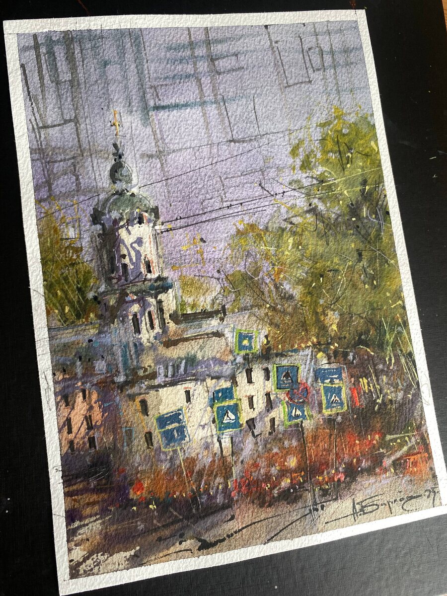 Церквушка где-то в центре. Не помню где точно) Наброски сделал давно уже а на красил вот тол ко сейчас и то , просто из головы. #акварель #пейзаж #москва #рисунок