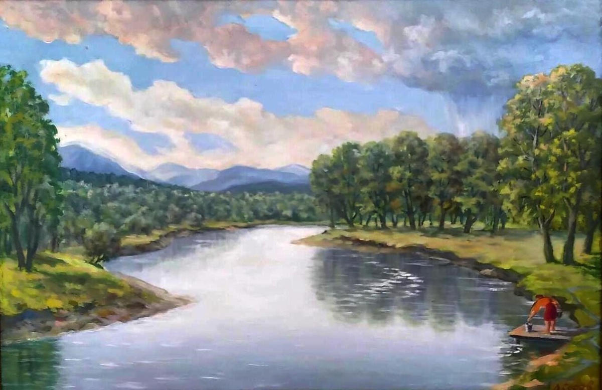 Художник подчеркнул красоту чистой горной реки, протекающей по просторам родной Ермаковской земли. Притягивает внимание зрителя небо с цветными плывущими облаками. Здесь можно увидеть и серо-розовый и синий, и голубой, и белый цвет. Пейзаж просто завораживает зрителя!