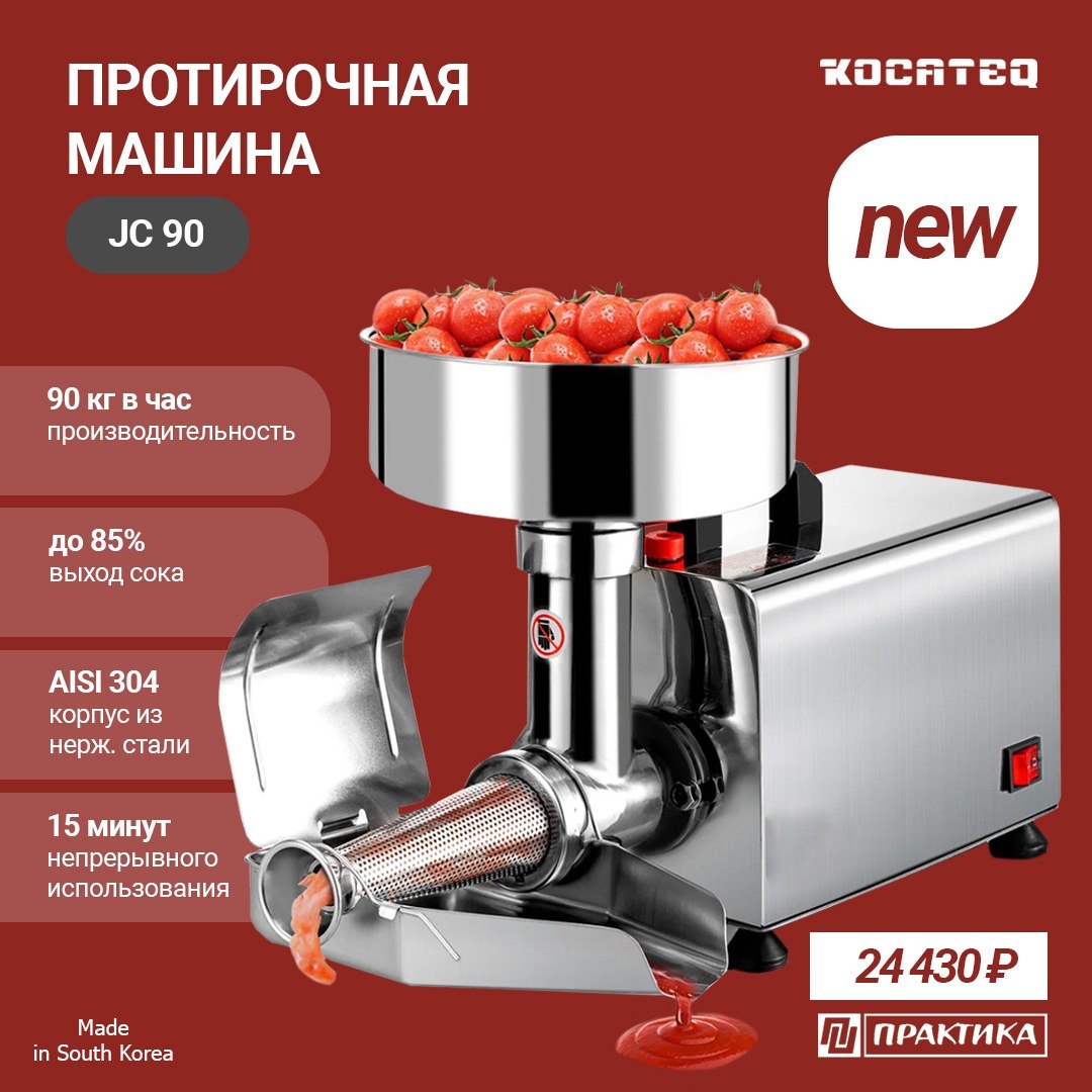 KOCATEQ представил новую протирочную машину JC 90 - это универсальное оборудование, которое значительно ускоряет и упрощает процесс переработки продуктов. Она предназначена для измельчения, протирания и отделения мякоти от кожуры, косточек или волокон, что позволяет быстро получать пюреобразную или однородную массу.