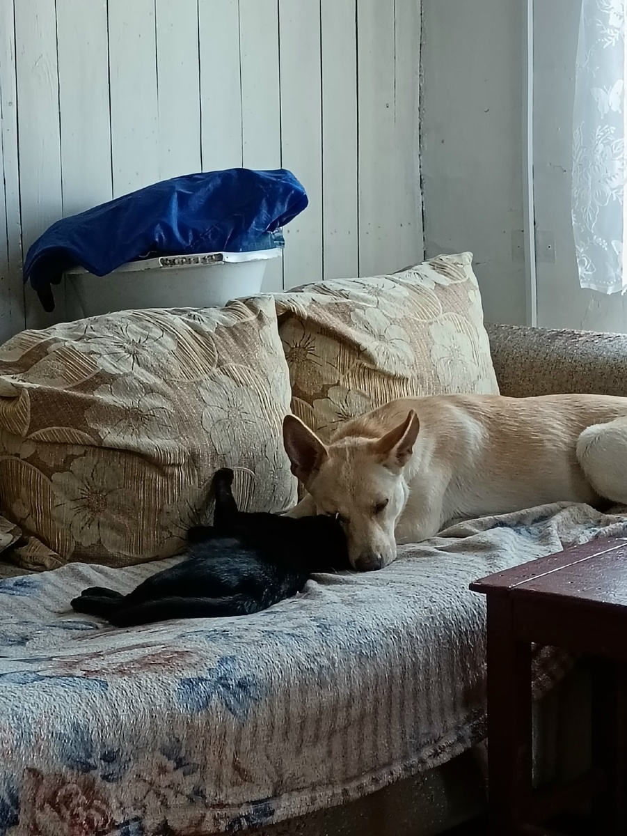 Когда мы принесли в дом Луну — нашу уличную «найдёнышку» с грустными глазами и виляющим хвостом, — две наши кошки отреагировали… по-разному. Тефтеля, чёрная пантера в миниатюре, тут же встала в боевую стойку: уши назад, лапа с когтями наготове. Первые дни она методично лупила Луну по морде при любой возможности — видно было, что за её агрессией скрывается страх. Не мудрено: Тефтеля выживала на улице, где собаки были не «милыми пёселями», а угрозой. А вот Беляшка, наша белоснежная охотница, отнеслась к собаке с царственным равнодушием. Она просто не знала, что собак надо бояться. Луна подходит? Ну и пусть. Нюхает? Спит рядом? Ну окей. Но самое удивительное случилось позже. Спустя месяца 3 или 4 Тефтеля вдруг перестала шипеть. Ещё через время начала спать на одном диване с Луной (правда, строго соблюдая дистанцию). А сейчас? Собака упирается кошке в пушистое пузико, а та мурлычет в ответ — хотя делает вид, что «терпит» эту наглость. Вывод: даже кошки с травматичным опытом могут научиться