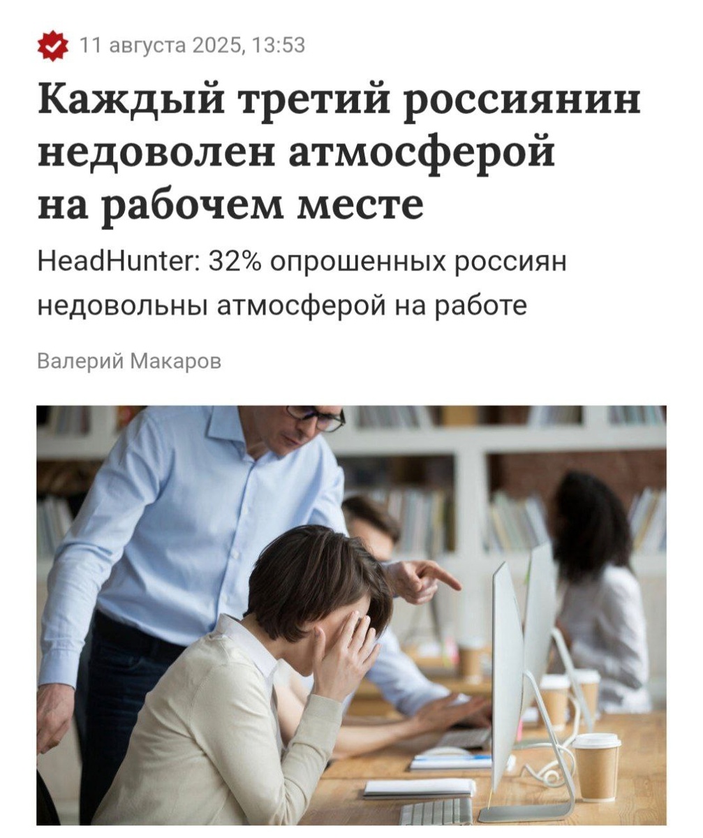 Опрос HeadHunter показал, что каждого третьего россиянина не устраивает атмосфера на работе Больше всего раздражают напряженные отношения с коллегами и отсутствие интереса со стороны руководства. Четверть опрошенных сталкиваются с грубостью, и столько же считают своего начальника некомпетентным. ➡️ При этом, почти половина россиян не смогли назвать ни одной положительной черты своего руководства А как обстановка на работе у вас? ❤️ — супер, все нравится! 👍 — сомнительно, но ок 🥲 — хочу все бросить и сбежать..