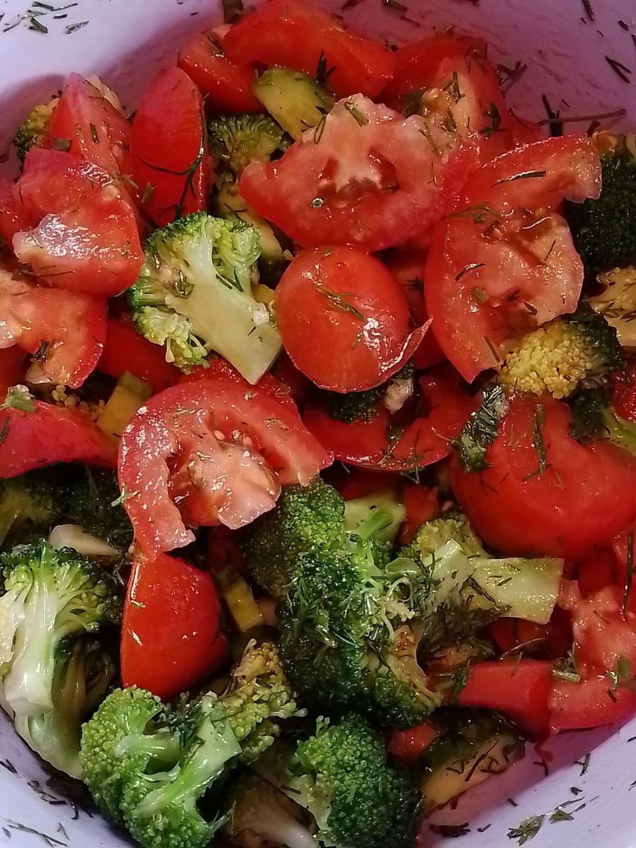 Яркий летний салат с брокколи Ингредиенты: Брокколи Помидоры Огурцы Зелень (у меня укроп и кинза) Чеснок Соевый соус Сахар Соль Уксус винный (можно и простой, 9% взять) Перец чёрный молотый Перец красный острый молотый Паприка молотая Масло растительное. Я всё беру в произвольных пропорциях и на глаз. После того, как перемешала, пробую на вкус, если чего-то не хватает -добавляю. В салате должны чувствоваться и остринка, и сладость, и кислинка. Ну и по соли, чтобы нормально было. Брокколи делю на соцветия, заливаю кипятком и оставляю на две минутки, затем кипяток сливаю, заливаю холодной водой. Сливаю на сито и оставляю, чтобы стекла вода. Помидоры и огурцы, мою, режу на кусочки, примерно такие же как соцветия брокколи по размеру. Зелень мелко режу. Складываю всё в одну чашку, добавляю приправы и специи, перемешиваю. Желательно дать салату постоять хотя бы час, так все овощи напитаются вкусами и получается очень вкусно. Приятного аппетита!