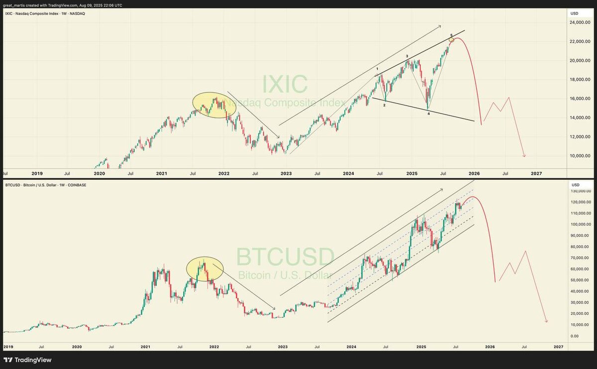 Когда в ленте рисуют апокалипсис В сетях всё чаще встречаются такие сценарии: Nasdaq якобы уходит в пропасть, а биткоин «зеркалит» падение почти до нуля. Логика авторов проста — графики похожи, значит и будущее одинаковое. Но давайте включим холодный анализ. 1. Историческая корреляция есть, но не постоянная. Nasdaq и BTC действительно синхронно падали в 2022-м, но были и периоды, когда биткоин рос при боковике или коррекции фондового рынка. 2. Технические фигуры — не приговор. Широкий расходящийся клин на Nasdaq — редкая формация, но её отработка не всегда означает обвал. Бывают ложные пробои или растянутые сценарии. 3. Макрофон сейчас другой. В отличие от 2021–2022, мы идём на снижении ставок, с активной ликвидностью и предвыборным циклом в США, что может продлить рост. 4. Психология паники. Чем ближе к вершине цикла, тем больше в инфополе «конца света». Это часто топливо для финального импульса, а не его концовка. И главный вопрос — успеет ли рынок завершить импульс до конца го