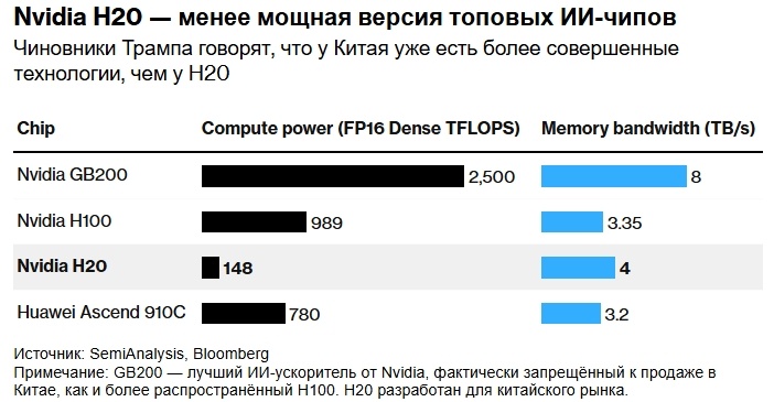 Чип H20 обладает меньшей вычислительной мощностью, чем топовые решения Nvidia, но его высокая пропускная способность памяти вполне подходит для этапа логического вывода в системах искусственного интеллекта, когда модели распознают закономерности и делают выводы. Это сделало его желанным продуктом для таких компаний, как Alibaba Group Holding Ltd. и Tencent Holdings Ltd. в Китае, где китайский лидер в области чипов, Huawei Technologies Co., испытывает трудности с производством достаточного количества передовых компонентов для удовлетворения рыночного спроса. По одной из оценок чиновников Байдена, которые рассматривали, но не внедрили контроль над продажами H20, потеря доступа к этому чипу Nvidia приведёт к тому, что для китайских компаний выполнение логического вывода на основе продвинутых моделей ИИ увеличится в три-шесть раз.