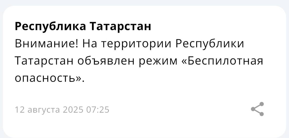 ☄️ Опасность атаки БПЛА в Татарстане В республике объявили режим «Беспилотной опасности». У местных жителей снова не работает мобильный интернет. В случае обнаружения БПЛА необходимо звонить по телефону 112. #город@topsmi16 👍 Подписаться на канал ПЛАТИМ ЗА ЭКСКЛЮЗИВНЫЕ КАДРЫ