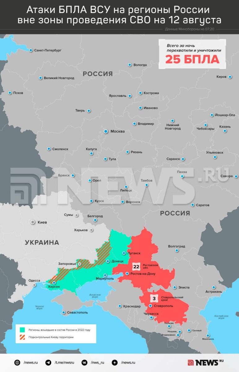25 украинских БПЛА сбили за ночь силы ПВО над регионами России, сообщили в Минобороны РФ. Из них 22 — над территорией Ростовской области и три — над территорией Ставропольского края. ⭕️ Подписаться | Прислать новость | Буст