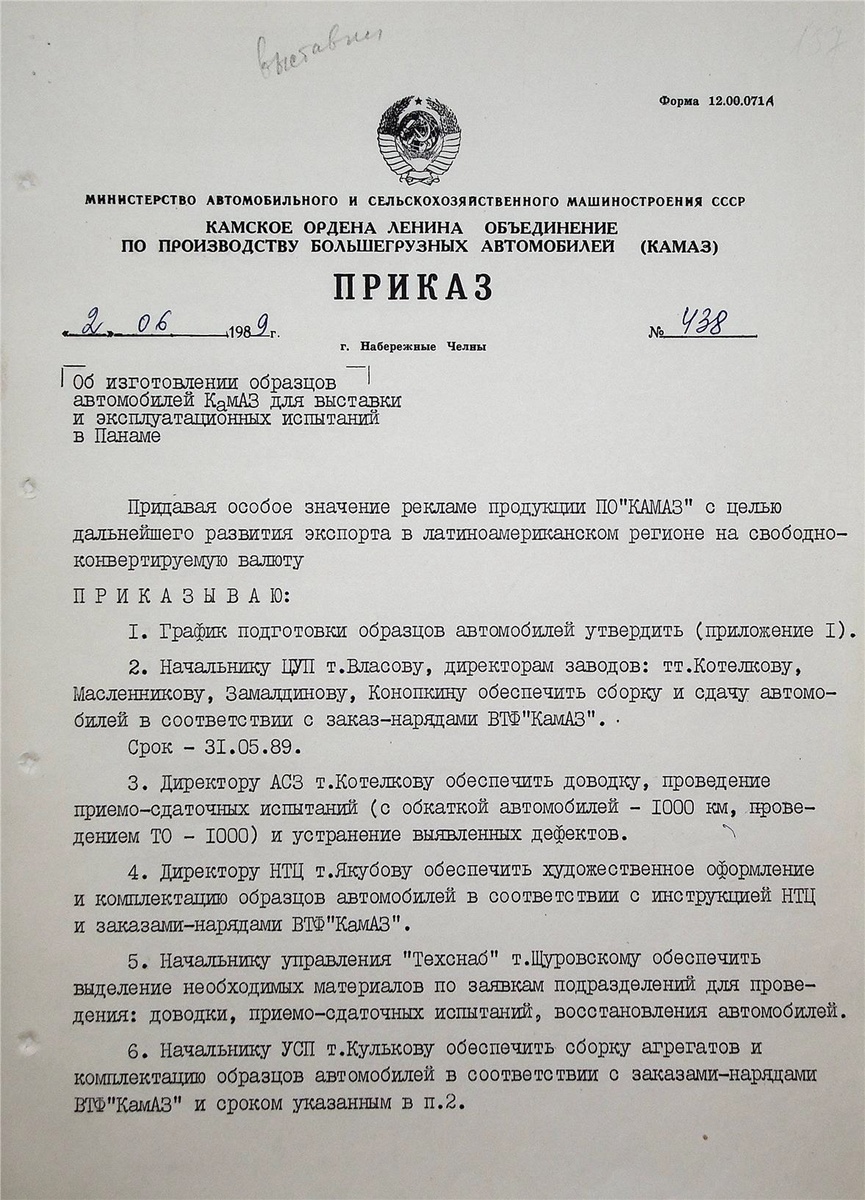 Перед вами приказ генерального директора №438 от 2 июня 1989 года «Об изготовлении образцов автомобилей КАМАЗ для выставки и эксплуатационных испытаний в Панаме». В графике подготовки автомобилей указаны модели автомобилей КАМАЗ, которые отправлялись в эту латиноамериканскую страну. Об истории автомобиля КАМАЗ-55111 ранее рассказывал здесь - https://dzen.ru/a/Y0fOGWqdijBEUiza