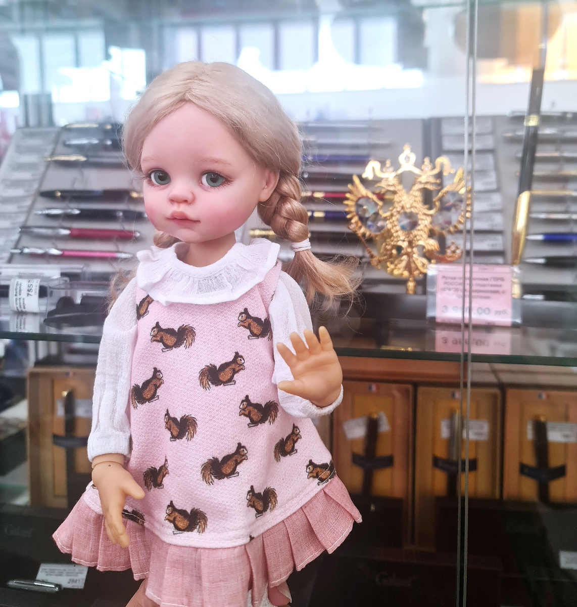 А вот и хозяйка магазина. Она оказалась очень высокомерной (и пыльной) и фотографироваться с нами не захотела. А мы и не расстроились, ведь в ГУМе куклы круче и не настолько заносчивые, а ведь в фото не отказали.