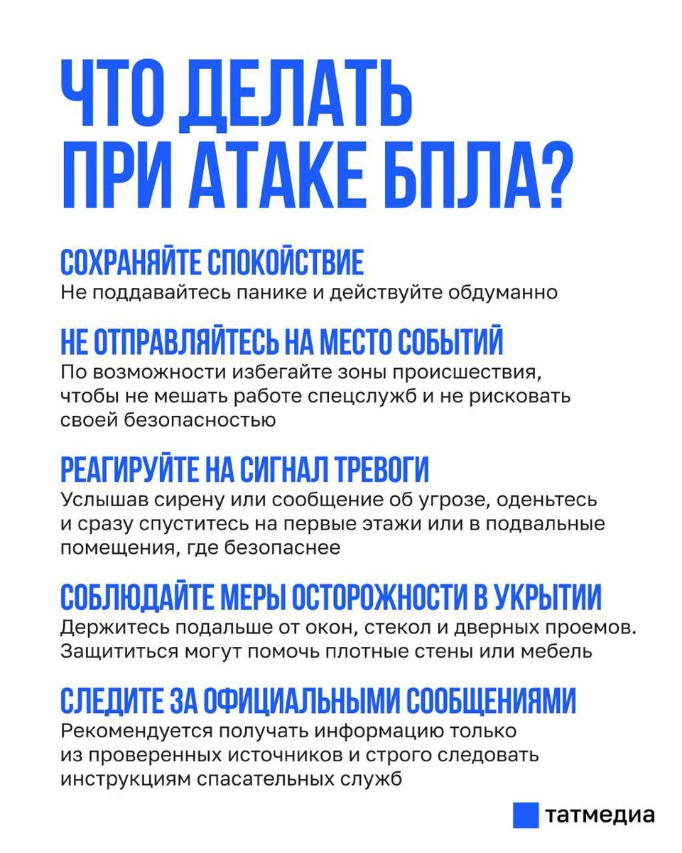 В ответ на пост ❕🛩 Друзья, просим вас сохранять спокойствие в связи с оповещением от МЧС Делимся правилами, которые нужно соблюдать при атаке БПЛА: сохраняйте и делитесь с близкими. @tatmediaofficial