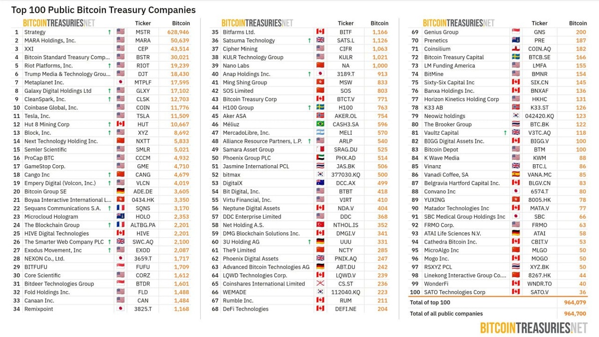 🔸По состоянию на 11 августа топ-100 публичных компаний владеют 964 079 BTC