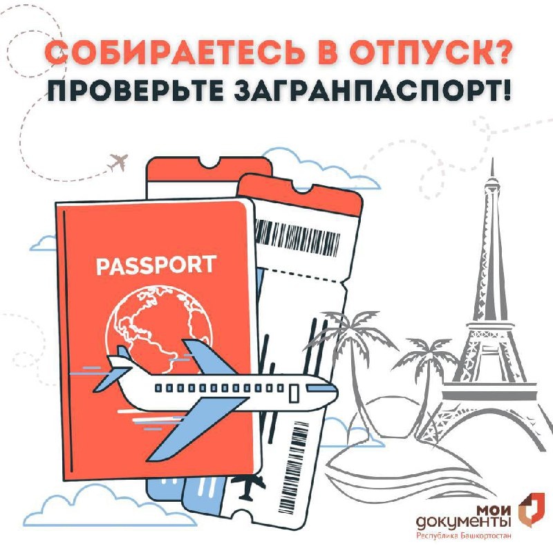 🏝Собираетесь в отпуск? Проверьте загранпаспорт! 🌏 МФЦ Республики Башкортостан напоминает: перед планированием поездки за границу убедитесь, что ваш загранпаспорт действителен! 🧭Важно внимательно проверять загранпаспорт. Ошибки в нем при выезде из страны могут привести к признанию документа недействительным и его изъятию на границе. Чтобы избежать неприятностей, рекомендуем проверять загранпаспорт сразу после его получения в МФЦ: 💬 орфографические ошибки 💬 опечатки 💬 ошибки в машиночитаемой записи 💬 отсутствие повреждений 💬 соответствие внешности фотографии в паспорте #МФЦБашкортостана