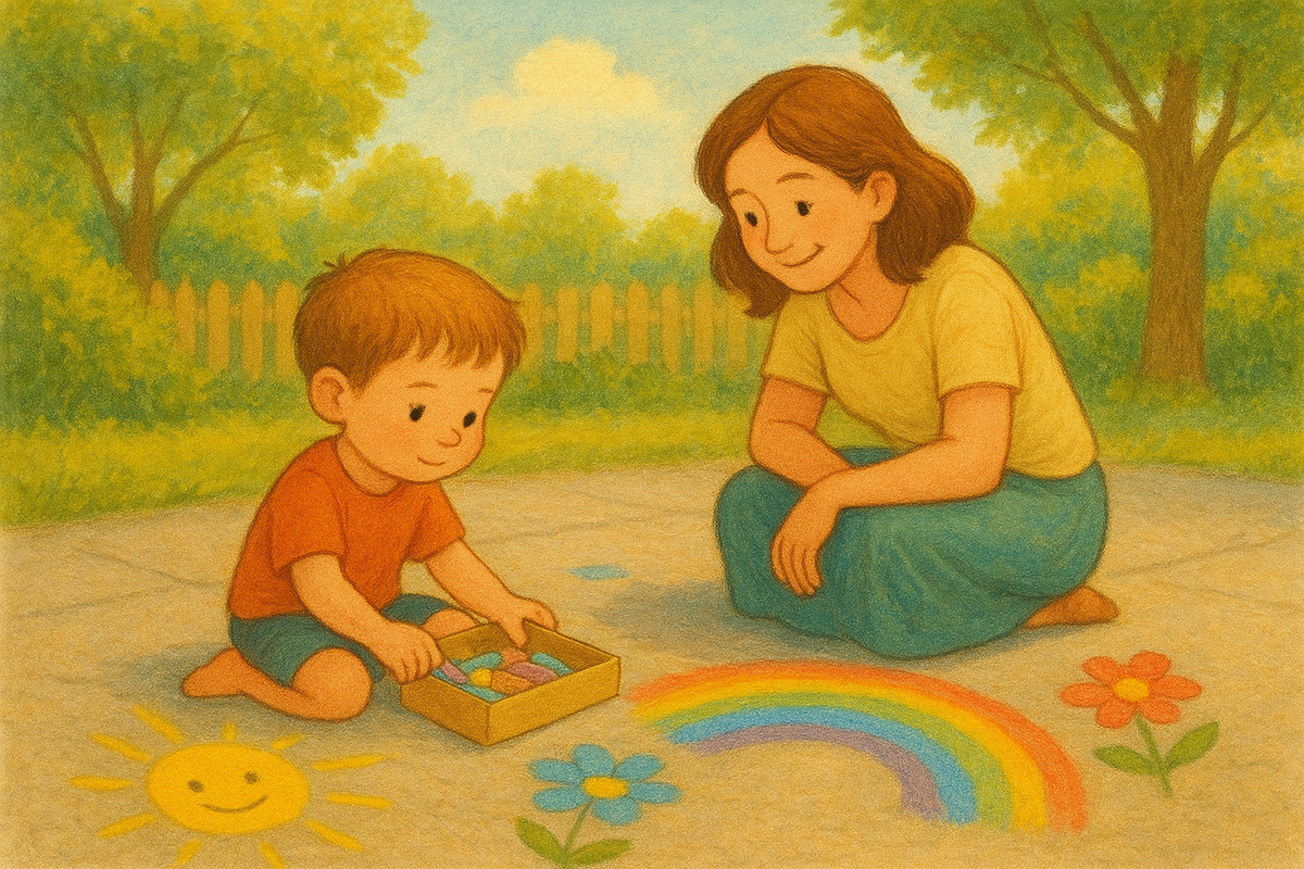 Предложите ребёнку представить, что асфальт — это большой мольберт. Сначала можно посмотреть обучающее видео «Рисуем на асфальте» — оно подскажет простые и эффектные техники.