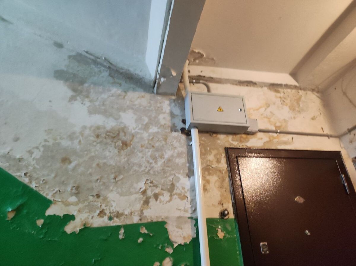 Мокрых стен уже не видно, но последствия пролива остались заметными. Вероятно, стояк в квартире, действительно починили, и теперь подъезд нуждается не в устранении протечки, а в косметическом ремонте, ответственность за который должна взять на себя управляющая компания.