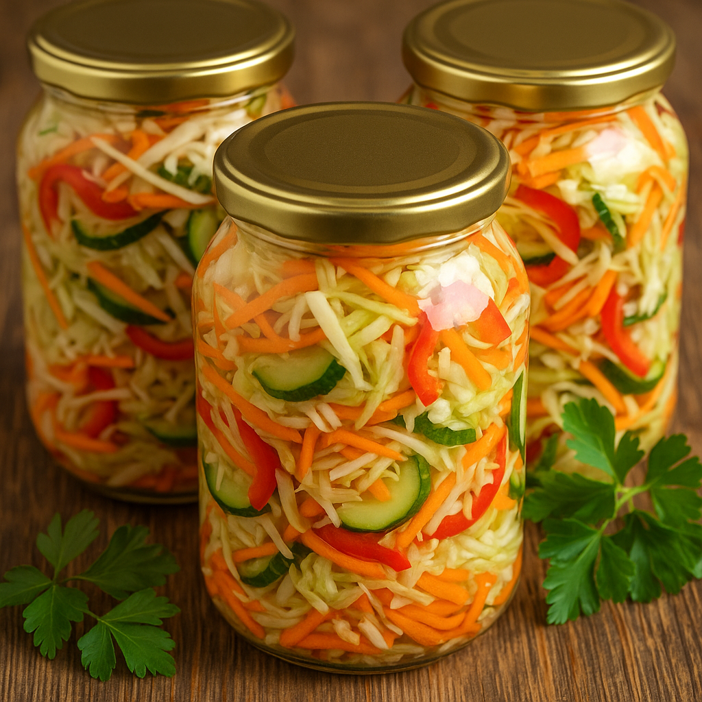 Этот салат в банке — просто спасение зимой. Никакого уксуса, никакой стерилизации, никакой возни у плиты. Овощи хрустят так, будто их только что сорвали с грядки, а аромат зелени напоминает лето. Секрет прост: правильные пропорции и чуть-чуть терпения. Хранится в холодильнике или погребе до самой весны, а съедается гораздо раньше — уж слишком вкусно! Ингредиенты (на 3 литровые банки по 1 л) Приготовление 1️⃣ Подготовка овощей Капусту шинкуем, морковь натираем на крупной тёрке, перец нарезаем тонкими полосками, огурцы кружочками, лук полукольцами. 2️⃣ Заправка В большой миске смешиваем соль, сахар, масло и лимонный сок. 3️⃣ Смешивание Высыпаем все овощи в миску, перемешиваем руками, слегка прижимая, чтобы пошёл сок. 4️⃣ Расфасовка Овощи вместе с соком раскладываем по стерильным банкам, плотно утрамбовываем. 5️⃣ Хранение Закрываем крышками и убираем в холодильник или погреб. Салат готов к употреблению уже через сутки. Совет Если хотите ярче вкус — добавьте горсть рубленой зе