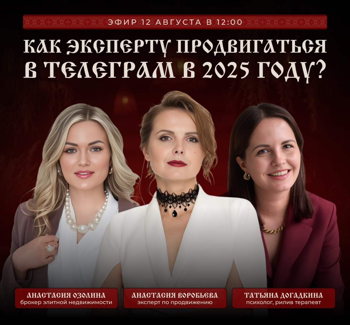 👑 Финальный сбор Властителей Сегодня, 12 августа в 12:00 по Москве — финальный эфир. Тот самый, после которого вы либо двигаетесь вперёд, либо остаетесь там, где были. Вчера телеграм решил проверить нас на прочность: — у кого-то вылетали эфиры, — у кого-то отваливались функции, — мы с трудом добавляли народ в папки. Но мы устояли. И за эту стойкость я даю вам последний шанс зайти в 🐦⬛ КАРДИНАЛьный год по стартовой цене. Только на время эфира После цены вырастет безвозвратно, а подарки сгорят. 📌 Что будет на эфире 1️⃣ Живое доказательство силы моей методологии 🐦⬛ КАРДИНАЛьный год — новая программа, созданная на десятках кастдевов и реальных запросах экспертов. Сегодня я покажу вам, как эта система уже сработала для моих учениц: ✨ Анастасия Озолина — превратила опыт в недвижимости в актив, который притягивает премиальных клиентов. ✨ Татьяна Догадкина — убрала синдром самозванца и выстроила систему для потока клиентов на психологические консультации. 2️⃣ Пир победителей П