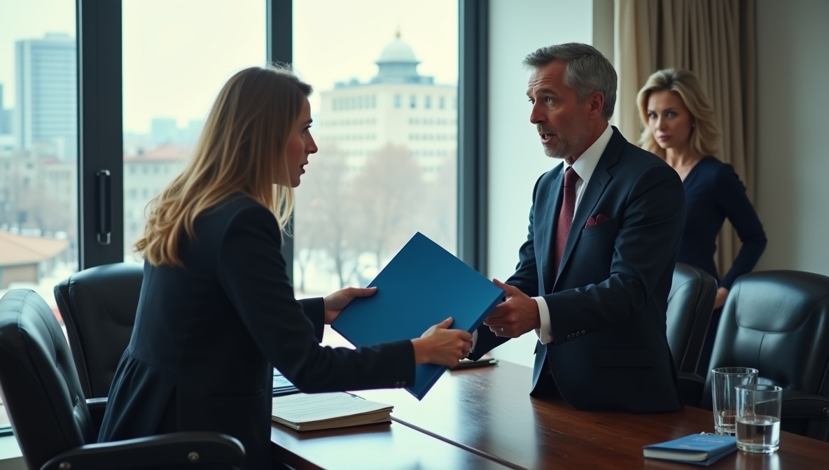 Наталья замерла. Внутри всё клокотало от гнева и обиды, но она помнила наставление своего адвоката: сохранять спокойствие. Она медленно наклонилась к своей сумке, достала оттуда синюю папку и молча протянула её Виктору.