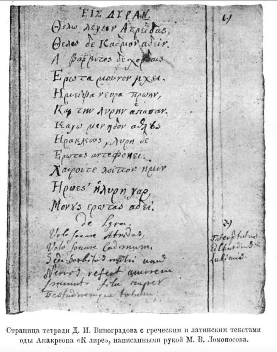 Нам уже приходилось писать о том, что Ломоносов не только переводил с латыни, но и свободно изъяснялся на ней. А насколько хорошо Михайло Васильевич владел греческим? В то время, когда Ломоносов учился в Славяно-греко-латинской академии, греческий язык там не преподавался; тем не менее, как считает Андрей Николаевич Егунов («Ломоносов — переводчик Гомера», 1962), «Ломоносов несколько знал по-гречески, научившись этому языку еще в Москве, до выезда за границу». В архиве изобретателя русского фарфора Дмитрия Ивановича Виноградова сохранилась студенческая рукопись Ломоносова — по-видимому, первый его опыт поэтического перевода с греческого. Это ода Анакреонта «К лире». Перевод был сделан около 1738 г. по тексту, который Ломоносов переписал из статьи Готшеда 1733 г. Как сама статья, так и опубликованные в ней переводы на европейские языки, включая латынь, служили пособием Ломоносову в этом опыте. Факсимиле автографа приводим по статье Елены Яковлевны Данько (1940), которая и нашла пере