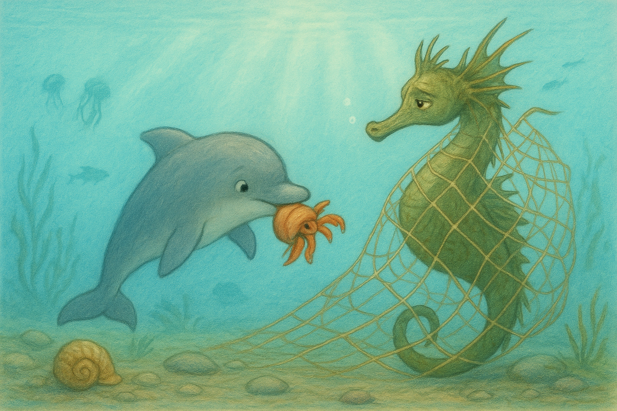 Малыш Лу часто задумывался, как стать самым лучшим дельфином. Играя с сестричкой Зи в догонялки, он старался её обогнать, но ему редко это удавалось. Зи была старше и проворнее. То же самое происходило, когда Лу соревновался с Зи в прыжках над водой. А охотиться, как взрослые дельфины, он ещё не умел. – Как же я стану лучшим, если Зи более ловкая, чем я, – размышлял дельфинёнок. С некоторых пор он полюбил разговаривать с Раком – отшельником, у которого всегда находилось время для общения с малышом. – Скажи, для чего ты таскаешь с собой такую большую тяжёлую раковину? – Это мой дом! Я могу в нём спрятаться от любой опасности! – отвечал рак. – А почему у дельфинов нет своего дома? – спросил Лу. – У дельфинов есть дом! Это весь океан! Ты можешь гордиться, ведь у тебя самый большой дом на свете! – сказал Рак–отшельник. – Подумайте только, они считают, что океан принадлежит дельфинам! – возмутился Морской дракон. – Выходит, что дельфины здесь самые главные! А я тоже живу в океане и
