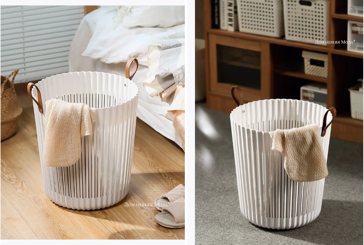 Вот она, корзина, которая не прячется в углу ванной, а становится стильным элементом интерьера! Эта корзина — настоящее чудо. Она сделана из ударопрочного пластика, имеет приятную матовую текстуру и выглядит очень современно. А ручки из экокожи — это вообще отдельная песня, тактильно очень приятно и удобно.